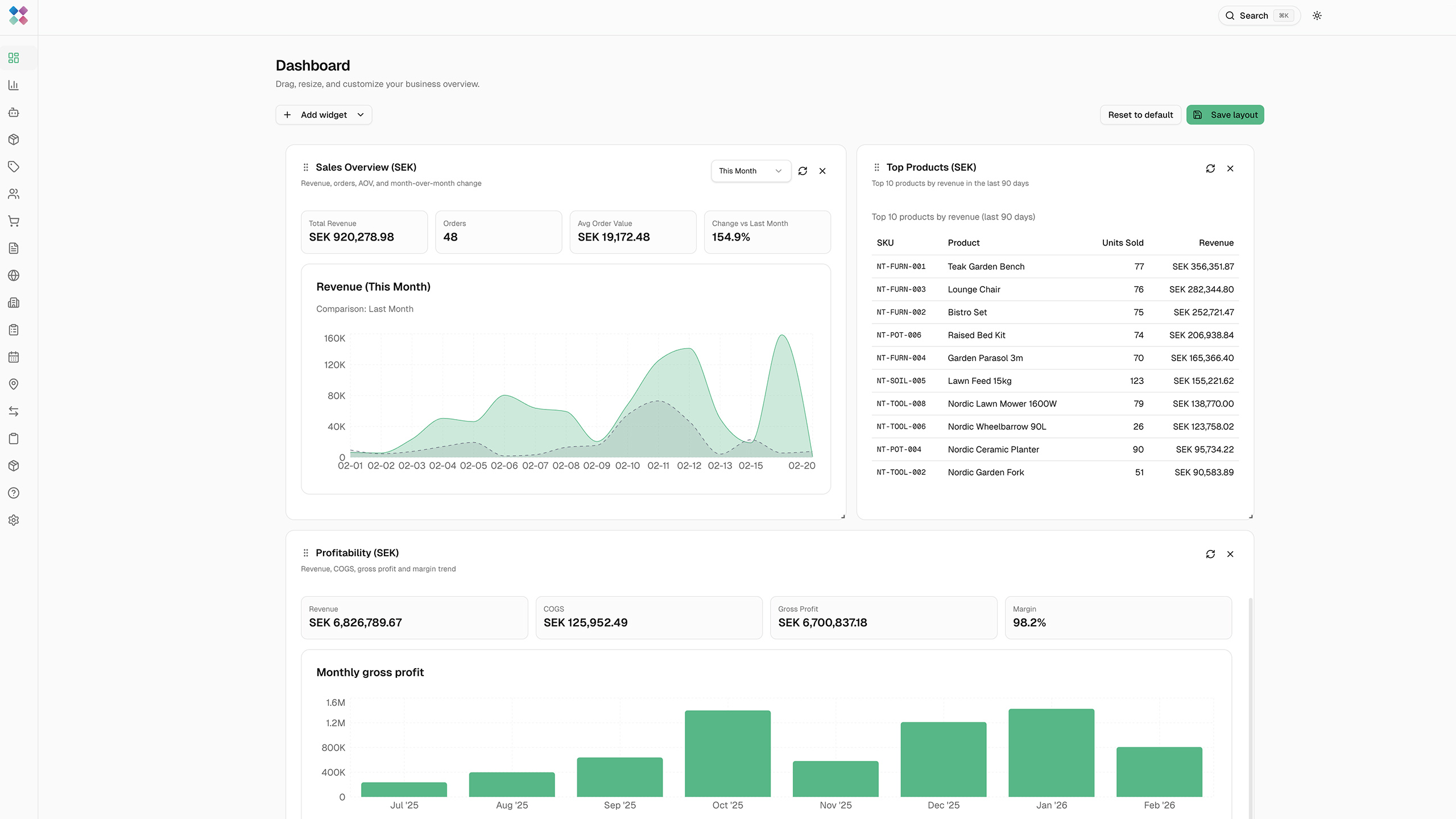 Bring your own OpenAI or Anthropic API key. The AI queries your real business data to generate reports, detect anomalies, compare periods, and answer questions in natural language.